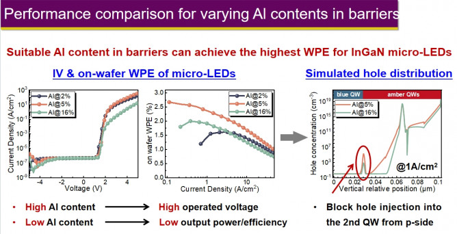 研究還優(yōu)化了勢壘中的Al組分以進(jìn)行應(yīng)變補(bǔ)償。這是一種在實(shí)現(xiàn)具有高插座效率的InGaN紅色微型LEDs方面的權(quán)衡方法。較高的Al組分可以有助于提高銦并入,但會阻礙載流子注入而導(dǎo)致工作電壓升高。結(jié)果發(fā)現(xiàn),微量的5%Al摻雜是實(shí)現(xiàn)1A/cm2下低電壓2.15V的最佳方法,同時,直徑為10μm的微型LEDs的插座效率在1A/cm2下約為4%。此外,研究還使用光致發(fā)光和壽命分布情況來檢查微型LEDs中的側(cè)壁效應(yīng)。這些紅色I(xiàn)nGaN微型LEDs的結(jié)果表明了InGaN材料在未來全彩顯示應(yīng)用中的巨大潛力。