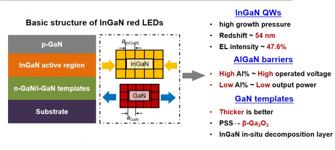 InGaN基發(fā)光二極管(LED)是藍(lán)綠光波段的高效光源,并在過去幾十年成功商業(yè)化。將其光譜范圍擴(kuò)展到紅色區(qū)域會導(dǎo)致InGaN基LED效率顯著降低。這種降低主要?dú)w因于高In含量的InGaN量子阱(QWs)的晶體質(zhì)量差,這是由于晶格失配和低生長溫度所致。
