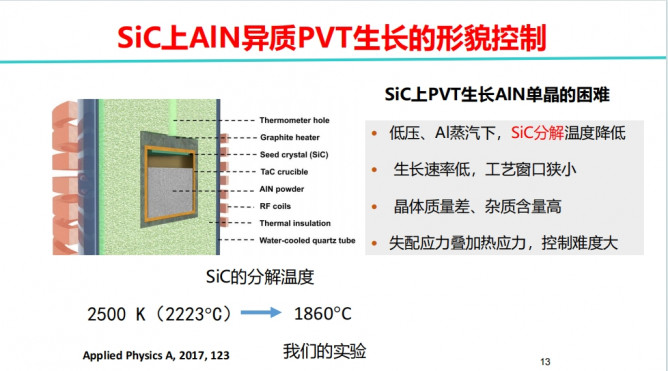 AlN單晶襯底以其優(yōu)異的性能和潛在的應用前景引起了人們的廣泛研究興趣. 物理氣相輸運(PVT)是最適合AIN襯底制備的方法。在大尺寸SiC單晶上異質(zhì)生長AlN籽晶,并在隨后的同質(zhì)生長中迭代優(yōu)化AlN的晶體質(zhì)量,是制備大尺寸AlN襯底的重要技術(shù)路線。然而,這一大尺寸AlN單晶制備技術(shù)面臨諸多的挑戰(zhàn),包括異質(zhì)生長中SiC在AlN生長溫度下的分解對籽晶表面的刻蝕,導致AlN晶體質(zhì)量差和形貌粗糙,以及在大尺寸同質(zhì)生長中抑制熱應力弛豫導致的裂紋,以及生長晶體和表面質(zhì)量控制和優(yōu)化。