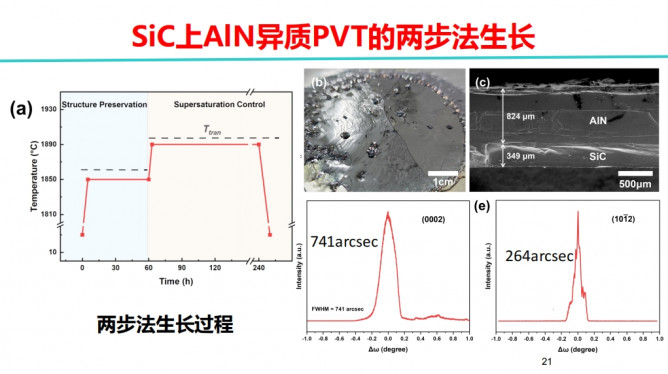 報告中于教授詳細介紹了研究進展與結(jié)果。研究首先結(jié)合計算流體動力學(CFD)模擬和 PVT生長實驗,研究了SiC襯底上AlN的PVT生長的表面控制。結(jié)果表明,在活性Al蒸氣的PVT生長中,保持有宏觀臺階的SiC襯底的表面結(jié)構(gòu)十分重要,這需要在初始階段將生長溫度和壓力限制在適當?shù)姆秶鷥?nèi),直到AlN層完全覆蓋SiC表面。研究還發(fā)現(xiàn)在后續(xù)的生長中,襯底表面附近的過飽和度控制對生長模式具有重要的影響。過飽和度增加導致從二維生長向三維生長的轉(zhuǎn)變,從而使表面形貌變得粗糙。研究發(fā)現(xiàn)在500 mbar的壓力下,相應的模式轉(zhuǎn)變溫度Ttran在1890°C到1910°C之間。以此為基礎(chǔ),提出了兩步法生長的方案,即先將生長溫度Tg保持在接近SiC表面宏觀可以保持的溫度上限生長,在SiC表面被AlN覆蓋后,將Tg升高到接近Ttran,以較高的速率進行生長。運用兩步法,實現(xiàn)了厚度為824μm的表面光滑呈鏡面狀的2英寸以上的AlN單晶。
