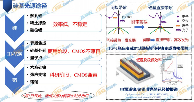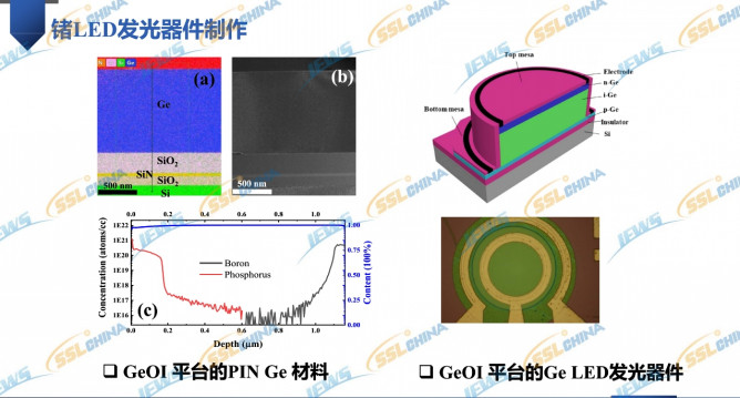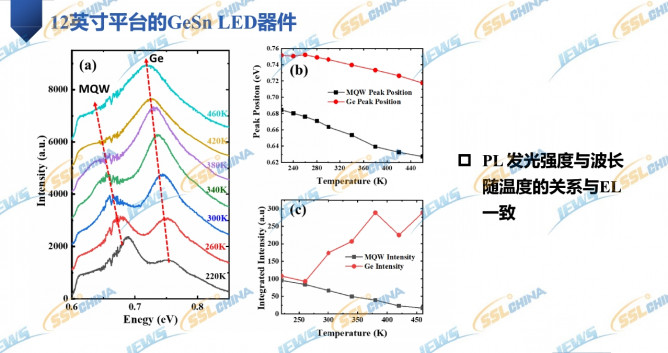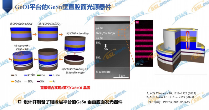報(bào)告中詳細(xì)分享了6-8英寸GeOI平臺(tái)鍺LED器件、12英寸硅平臺(tái)的GeSn LED器件、8英寸 GeOI平臺(tái)的GeSn垂直腔面光源器件等研究進(jìn)展。其中,關(guān)于6-8英寸GeOI平臺(tái)鍺LED器件,采用直接晶圓鍵合法制備高質(zhì)量6-8英寸完整GeOI晶圓。張應(yīng)變鍺器件方面,實(shí)現(xiàn)兩種兼容PIN結(jié)的外力施加應(yīng)變方法;應(yīng)用于探測(cè)器,L波段探測(cè)率超過(guò)商用鍺探測(cè)器2-3倍。