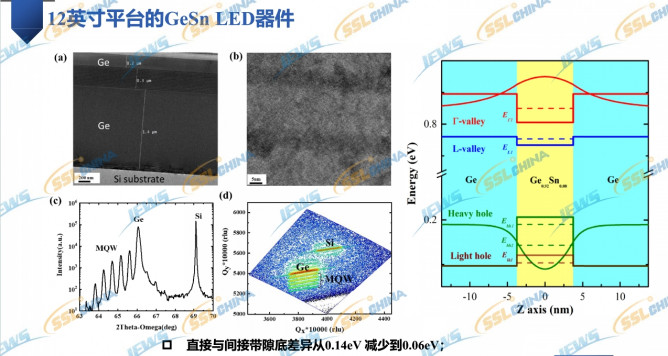 過(guò)去的二十年來(lái),硅光子學(xué)得到了蓬勃的發(fā)展。然而,片上集成的CMOS兼容的光源仍然是一個(gè)挑戰(zhàn)。與Si間接帶隙不一樣,鍺(Ge)是一種準(zhǔn)直接帶隙材料,其直接、間接帶隙能谷底差異僅為 0.136 eV。此外,由于為IV族材料且可直接在硅上生長(zhǎng),Ge近十年來(lái)逐漸成為實(shí)現(xiàn)CMOS兼容硅基光源的潛在材料。根據(jù)理論計(jì)算,通過(guò)>8% 的Sn摻雜方法,鍺將改性成為直接帶隙半導(dǎo)體,從而實(shí)現(xiàn)高效發(fā)光?;诖?,其研究使用商業(yè)通用的RPCVD 在12英寸硅襯底上采用贗晶生長(zhǎng)策略外延了低位錯(cuò)Ge/GeSn LED外延薄膜,實(shí)現(xiàn)了整個(gè)發(fā)光材料領(lǐng)域范圍內(nèi)(包括GaN、InP等)光源器件罕見的12英寸大晶圓外延生長(zhǎng)。由于錫摻雜降低了直接帶隙與間接帶隙的差異,該LED器件的發(fā)光強(qiáng)度是傳統(tǒng)鍺材料的28倍。大尺寸晶圓不僅可以大幅度提高LED外延片利用效率,并且更利于兼容成熟的硅IC設(shè)備及工藝、降低成本。該成果實(shí)驗(yàn)上證實(shí)了大尺寸、低成本硅基光源的可行性。