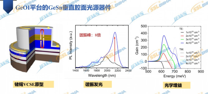 12英寸平臺(tái)的GeSn LED器件方面,實(shí)現(xiàn)高質(zhì)量CVD外延法6英寸GeSn生長(zhǎng)突破,實(shí)現(xiàn)直接帶隙GeSn薄膜;與美國(guó)應(yīng)用材料公司合作,實(shí)現(xiàn)12英寸硅襯底Ge/GeSn MQW單晶薄膜生長(zhǎng)。8英寸 GeOI平臺(tái)的GeSn垂直腔面光源器件方面,設(shè)計(jì)并制備了絕緣層平臺(tái)的GeSn 垂直腔面發(fā)光器件。GeSn LED光源器件在2微米波段實(shí)現(xiàn)了8倍增強(qiáng)的諧振峰,未來(lái)需要加強(qiáng)研究實(shí)現(xiàn)硅基GeSn 電注入激光器。