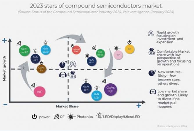 射頻砷化鎵(RF GaAs)與5G和汽車連接相結(jié)合,預(yù)計(jì)將迎來(lái)復(fù)興;而射頻氮化鎵(RF GaN)則在國(guó)防、電信和航天工業(yè)中找到了自己的利基市場(chǎng),并將目光投向了高功率應(yīng)用。在光子學(xué)(Photonics)領(lǐng)域,磷化銦(InP)和砷化鎵(GaAs)處于領(lǐng)先地位,InP在人工智能應(yīng)用的推動(dòng)下復(fù)興,而GaAs光子學(xué)由于各種市場(chǎng)動(dòng)態(tài)而略有增長(zhǎng)。MicroLED顯示出潛力,盡管它們的廣泛采用之旅仍在逐步展開(kāi)。