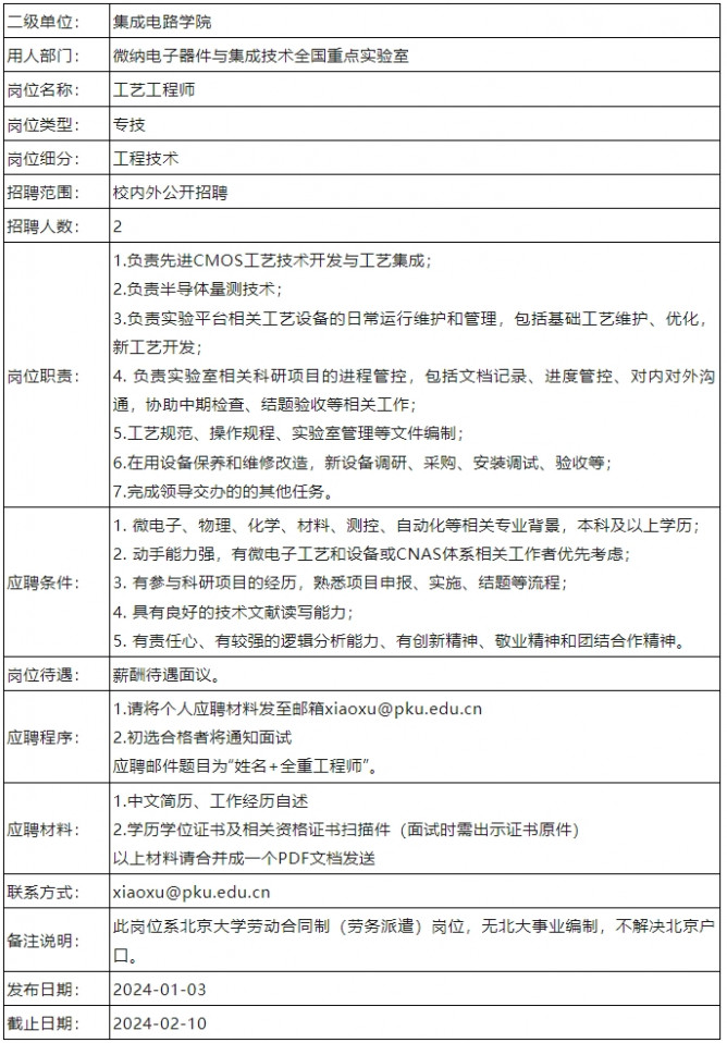 北京大學集成電路學院招聘專技2人,2.10截止
