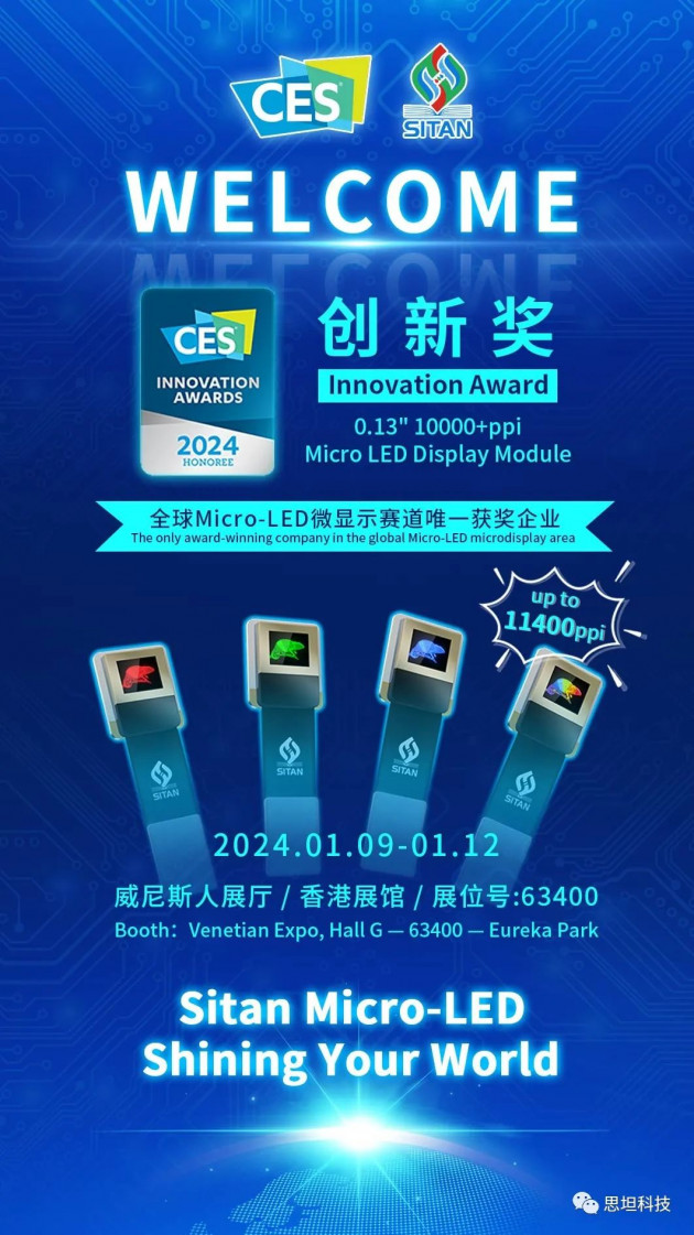 CES 2024展會于1月9日-1月12日在美國拉斯維加斯舉行。此前,國產(chǎn)Micro LED微顯示初創(chuàng)企業(yè)思坦科技曾宣布,將在CES 2024展會上展示0.13英寸、實際分辨率高達11400 PPI的Micro LED微顯示器。
