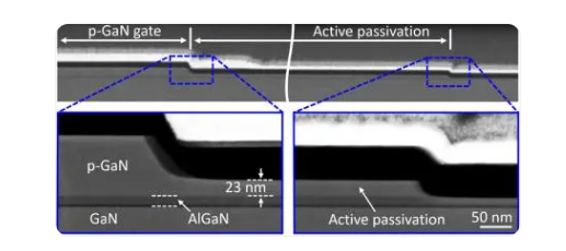 在零電壓偏置下,有源鈍化層耗盡下方的電子溝道,實現(xiàn)增強型工作模式。當需要器件導通時,研究人員采用一種與傳統(tǒng)器件截然不同的方式產生電子溝道。