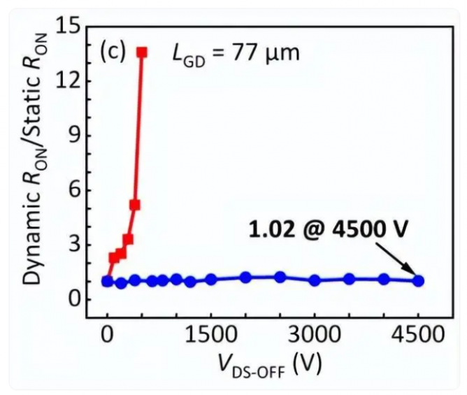 具體來說,在 4500V 工作電壓下,超高壓 GaN 功率器件的動態(tài)電阻退化僅為 2%。與之對比的是,同一晶圓上的傳統(tǒng)器件在 500V 工作電壓下,動態(tài)電阻退化已超過 100%。