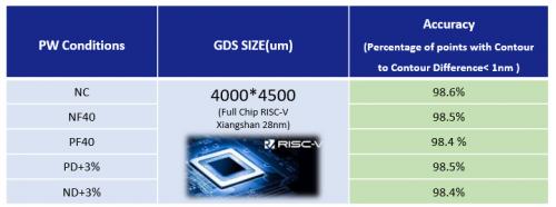 以一個完整的28nm節(jié)點的RISC-V full chip版圖為例,D2C給出的Contour和完整OPC Recipe給出的Contour在不同的工藝條件下(PW conditions)的差距基本上小于1nm,并且運(yùn)算速度遠(yuǎn)高于完整OPC Recipe,目前版本實測可提速約 80倍。