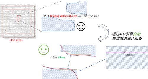 根據(jù)光刻仿真反饋局部自動微調(diào)設(shè)計版圖,對整個設(shè)計的改動微乎其微,對芯片設(shè)計本身的功能不會有影響,但是對實際的光刻卻能產(chǎn)生非常正面的幫助,屬于四兩撥千斤,針對某些頑固壞點可以起到撥云見日的效果。如下圖所示,0.2 nm 的Design 自動微調(diào),成效顯著: