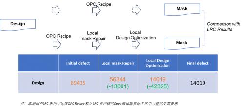 東方晶源在現(xiàn)有的計算光刻平臺PanGen 基礎(chǔ)之上,創(chuàng)新性的把局部Mask Repair 拓展到局部的Design微調(diào),推出PanGen dFO (defect free OPC)產(chǎn)品,以一種遞進(jìn)式的策略,持續(xù)自動查缺補(bǔ)漏,可提供更徹底的OPC 解決方案。 實踐中針對全芯片光刻仿真檢測(LRC)發(fā)現(xiàn)的壞點,首先采用局部Mask Repair 的辦法,如果能直接解決,則針對該壞點的處理結(jié)束。如果不能解決,則通過局部自動微調(diào)設(shè)計的方式來解決該壞點。例如開始有1000 個壞點,可能有相當(dāng)一部分已經(jīng)在第一步局部Mask Repair 的過程中被解決, 只有剩下少部分壞點會進(jìn)入下一步局部微調(diào)設(shè)計的步驟中。
