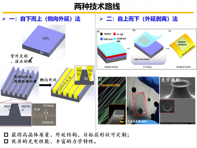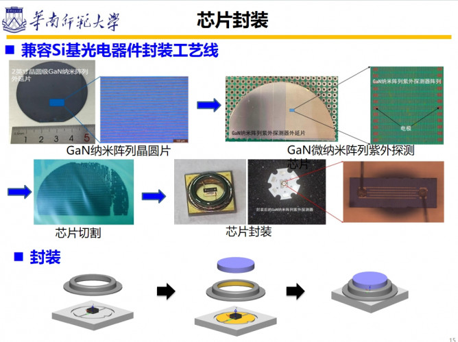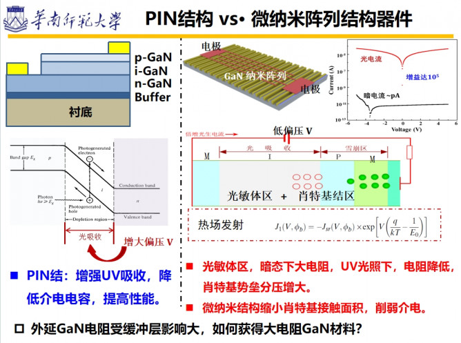 報(bào)告中詳細(xì)分享了選區(qū)側(cè)向外延制備GaN微納陣列、電化學(xué)剝離制備GaN微納結(jié)構(gòu)等的研究成果與研究進(jìn)展。其中,選區(qū)側(cè)向外延制備GaN微納陣列涉及選區(qū)側(cè)向外延、外延位錯(cuò)彎曲、單根微米線紫外探測(cè)、陣列微米線紫外探測(cè)、AlN 表面鈍化、芯片封裝內(nèi)容。電化學(xué)剝離制備GaN微納結(jié)構(gòu)涉及PIN結(jié)構(gòu) vs·微納米陣列結(jié)構(gòu)器件、電化學(xué)剝離、外延結(jié)構(gòu)設(shè)計(jì)、電化學(xué)選擇性腐蝕原理、自支撐微米線陣列、微納米陣列紫外探測(cè)、N極性面強(qiáng)表面電勢(shì)等。 報(bào)告指出,鈍化GaN表面缺陷,利于提高器件光電性能;原位AlN鈍化層,提高金屬-半導(dǎo)體接觸勢(shì)壘,抑制暗電流<1E-9;電化學(xué)剝離后,具有更優(yōu)異的弱光響應(yīng)能力;微納米陣列器件具有更好的線性特性,耐壓更高。