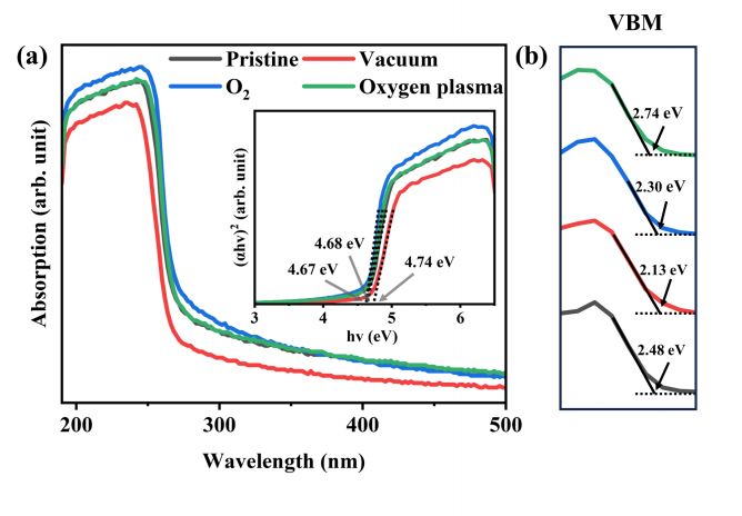 圖1. 未處理和退火后Ga2O3薄膜的 (a) 紫外可見吸收光譜和 (b) 價(jià)帶最大值。