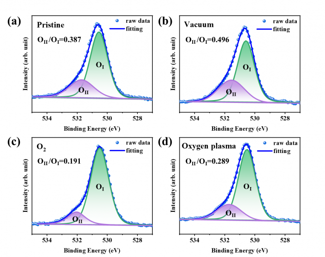 圖 2. (a) 未處理和在 (b) 真空中退火 (c) 氧氣中退火和 (d) 氧等離子體中退火后的Ga2O3薄膜XPS光譜中O 1 s峰的曲線擬合。