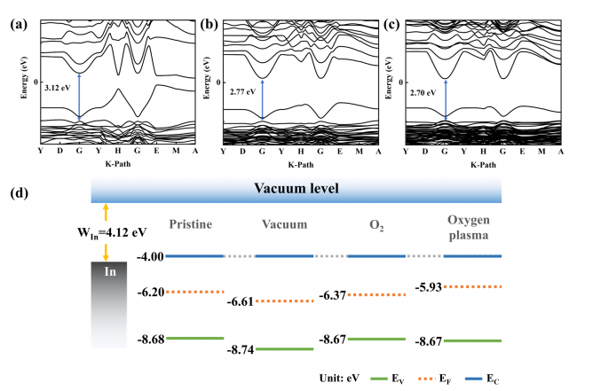 圖 3. (a) 單胞,(b) 1×2×1超晶胞和 (c) 1×3×1超晶胞模型的能帶結(jié)構(gòu)。(d) 由在不同氣體環(huán)境中退火的Ga2O3薄膜制備的光電探測器的能帶排列。