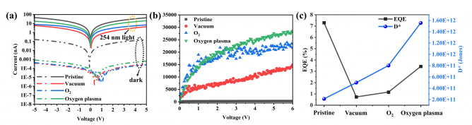 圖 4. 基于在不同氣體環(huán)境中退火的Ga2O3薄膜制備的光電探測器在黑暗中以及光強(qiáng)為220 μW/cm2的254 nm光照下的 (a) 半對(duì)數(shù)I-V曲線,(b) 光暗電流比以及 (c) 外量子效率和檢測率。