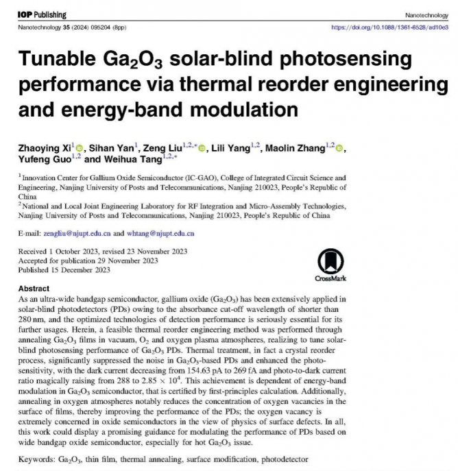 氧化鎵(Ga2O3)因其超寬的帶隙和高臨界擊穿電場,可滿足當(dāng)前器件大功率和微型化的發(fā)展需求,已成為新一代電力電子和光電器件的熱門材料。目前日盲紫外光電探測是Ga2O3的一個(gè)重要應(yīng)用,而提高其光電探測性能是Ga2O3研究的熱門話題之一。由于表面是器件中載流子傳輸和信號(hào)捕捉的主要部分,對(duì)表面的調(diào)控會(huì)在很大程度上改變器件的性能。然而,表面作為一個(gè)非常薄的有源層,難以實(shí)現(xiàn)對(duì)其有源通道特性的穩(wěn)定控制。目前,人們已經(jīng)探索并使用了許多表面調(diào)控方法來提高光電探測器的性能,其中引入局部表面等離激元和局部表面肖特基結(jié)是最常見的方法之一,但這種方法成本相對(duì)較高,操作也比較復(fù)雜。南京郵電大學(xué)唐為華教授研究團(tuán)隊(duì)提出了一種用于調(diào)控Ga2O3薄膜的表面電子結(jié)構(gòu)的簡單而廉價(jià)的熱重組工程,從而進(jìn)一步實(shí)現(xiàn)對(duì)其光電性能的調(diào)控。研究成果以“Tunable Ga2O3 solar-blind photosensing performance via thermal reorder engineering and energy-band modulation”為題,發(fā)表在IOP Publishing 《Nanotechnology》期刊上。