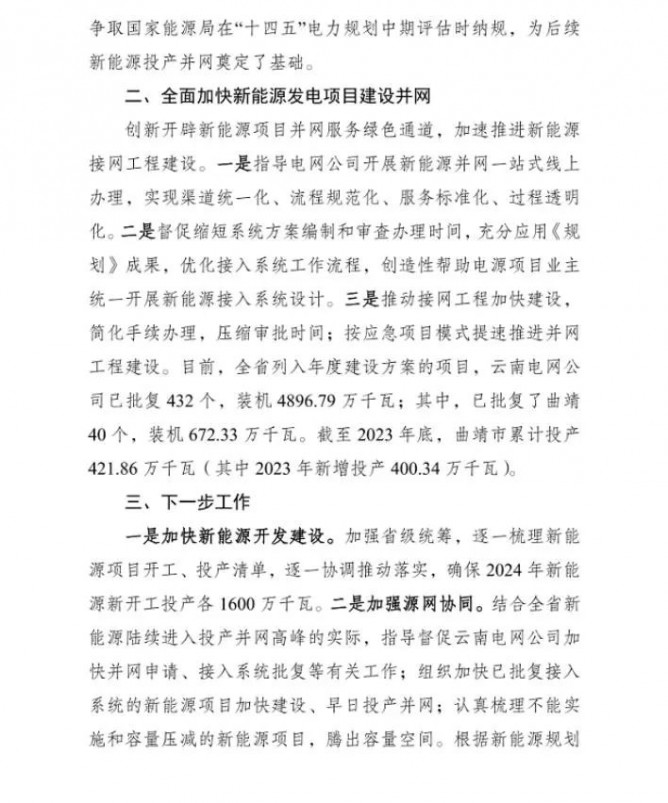 一是加快新能源開發(fā)建設(shè)。加強(qiáng)省級統(tǒng)籌,逐一梳理新能源項(xiàng)目開工、投產(chǎn)清單,逐一協(xié)調(diào)推動落實(shí),確保2024年新能源新開工投產(chǎn)各1600萬千瓦。