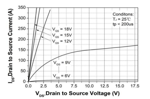 圖1. SiC MOSFET 輸出特性。在Tj = 25℃,Vgs = 18 V,RDS(on) = 3.5 mΩ