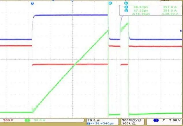 中國科學(xué)院電工研究所基于芯片產(chǎn)品SG2MA35120B完成了低雜感半橋模塊封裝,雙脈沖測試波形如圖6所示。中國科學(xué)院電工研究所研究員寧圃奇表示: “在中科院交叉團(tuán)隊(duì)項(xiàng)目和國家重點(diǎn)研發(fā)計(jì)劃新能源汽車專項(xiàng)項(xiàng)目的支持下,該單顆芯片在環(huán)境溫度為150°C且母線電壓為800V時(shí)實(shí)現(xiàn)了350A的電流輸出能力。本芯片特別適用于大功率車用電驅(qū)系統(tǒng),可有效抑制并聯(lián)大數(shù)量小電流芯片帶來的不均流、不均溫難題”。