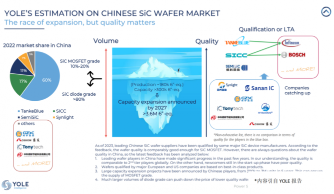 就項(xiàng)目進(jìn)展而言,天科合達(dá)于2023年6月成功啟動(dòng)了其“第三代半導(dǎo)體材料產(chǎn)業(yè)園”項(xiàng)目,并在當(dāng)年12月江蘇天科合達(dá)的碳化硅襯底二期擴(kuò)產(chǎn)項(xiàng)目完成封頂,預(yù)計(jì)該項(xiàng)目將于2024年6月完工并投入生產(chǎn)。這將為市場(chǎng)增加16萬(wàn)片碳化硅襯底的產(chǎn)能,有效緩解全球?qū)Ω咂焚|(zhì)車用級(jí)導(dǎo)電型碳化硅襯底的需求緊張狀況。