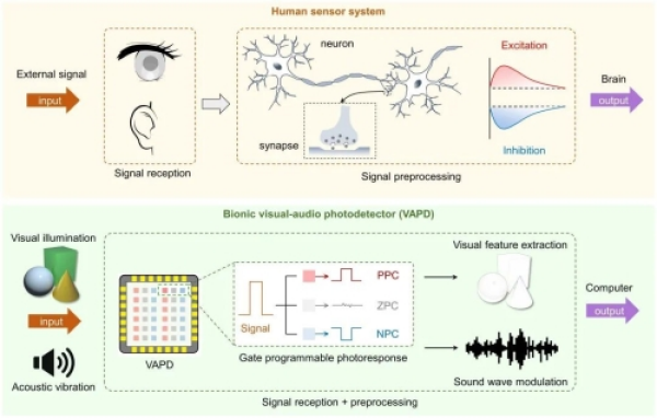 近日,中國科學院重慶綠色智能技術研究院微納制造與系統(tǒng)集成研究中心,在《科學進展》(Science Advances)上發(fā)表了題為《可片上探測和預處理的仿生視聽光電探測器》(Bionic visual-audio photodetectors with in-sensor perception and preprocessing)的研究論文。該研究提出了仿生“視聽”光電探測器,通過模擬人類感知系統(tǒng)中神經突觸間的“興奮”和“抑制”行為,在傳感端集成了“視聽”信號探測與預處理功能。