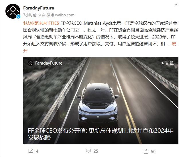 2月26日,法拉第未來(Faraday Future,以下簡稱“FF”)公布了來自其全球首席執(zhí)行官Matthias Aydt的公開信。公開信分享了法拉第未來最新整體規(guī)劃1.1版,并宣布了公司2024年的發(fā)展戰(zhàn)略。