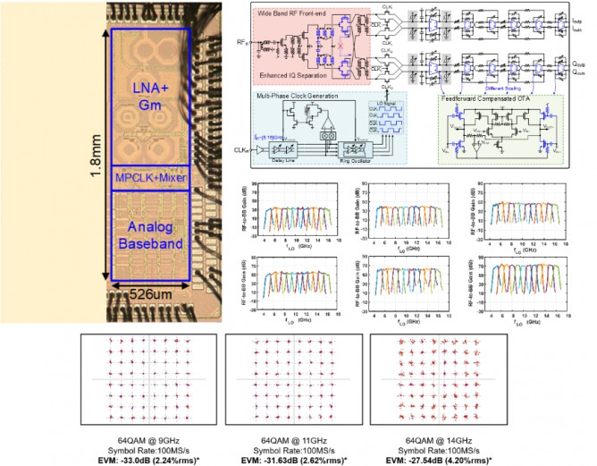 由閆娜教授負責(zé)的RFiCAE課題組在該方向取得了突破性進展,提出了一種覆蓋5-16GHz頻帶范圍同時具有最高500MHz基帶帶寬的寬帶可重構(gòu)射頻接收機,為多功能射頻一體化系統(tǒng)的設(shè)計提供了一種新的解決方案。相關(guān)工作以“A 5-to-16GHz Reconfigurable Quadrature Receiver with 50% Duty-Cycle LO and IQ-Leakage Suppression”發(fā)表于ISSCC 2024。論文第一作者為青年研究員許灝,畢俊彥、鄒騰浩等學(xué)生共同完成,教授閆娜為通訊作者。