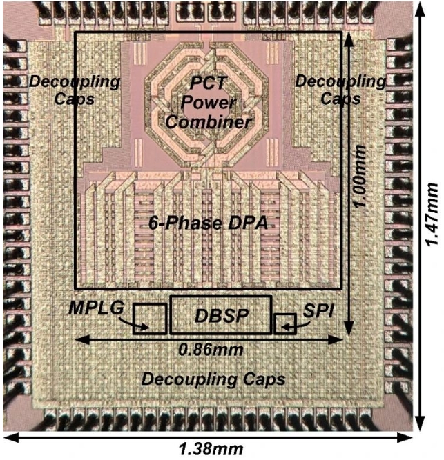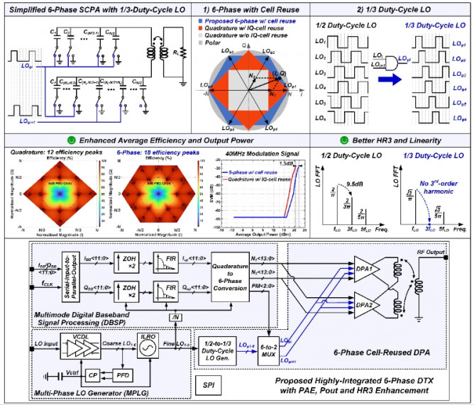 針對以上問題,該工作提出了一種1/3占空比本振信號的全數(shù)字發(fā)射機架構(gòu):利用1/3占空比方波的三階諧波為0的特點,大幅提升三階諧波抑制能力;同時,采用6相基礎(chǔ)矢量并結(jié)合單元復(fù)用技術(shù),實現(xiàn)更高的輸出功率和更大的復(fù)平面覆蓋范圍;此外,通過Doherty負載調(diào)制及關(guān)態(tài)電阻優(yōu)化技術(shù),進一步提高系統(tǒng)效率和線性度。采用28nm CMOS工藝,該芯片在0.7-2.5GHz頻段內(nèi)實現(xiàn)了大于45dBc的三階諧波抑制,是同類數(shù)字化發(fā)射機工作的首創(chuàng),同時輸出功率、效率和核心面積均達到國際領(lǐng)先水平。該研究成果有助于推進射頻芯片的快速集成和小型化,適用于5G/6G等新一代無線通信應(yīng)用。