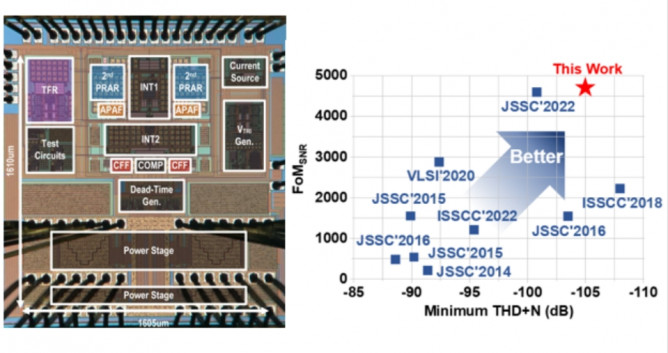 為了解決上述問題,復(fù)旦大學(xué)集成電路設(shè)計實驗室(ICD Lab)創(chuàng)新性地提出了應(yīng)用多種低功耗、寬帶有效的線性度提升技術(shù)的音頻D類放大器,相關(guān)研究成果以“A 0.81mA, -105.2dB THD+N Class-D Audio Amplifier with Capacitive Feedforward and PWM-Aliasing Reduction for Wide-Band-Effective Linearity Improvement” 發(fā)表于ISSCC 2024,并被評為模擬技術(shù)領(lǐng)域亮點論文(Highlight Paper)。該課題由徐佳偉和洪志良教授作為指導(dǎo)老師,論文的第一作者為直博生周凱文,并由唐敔翔、周健鴻等學(xué)生協(xié)助完成。