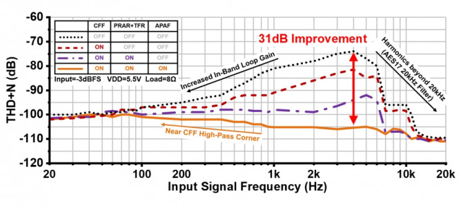 文章的亮點在于提出了多種可滿足低功耗設(shè)計需求的寬帶線性度提升技術(shù),可以在降低放大器電流消耗的情況下實現(xiàn)高線性度聲學(xué)輸出,適合于有小型化/輕量化需求的應(yīng)用環(huán)境。該放大器在0.81mA的靜態(tài)電流消耗性下,可以實現(xiàn)最優(yōu)-105.2dB的非線性失真與噪聲水平(THD+N),同時在20Hz-20kHz的全音頻帶寬內(nèi)實現(xiàn)了優(yōu)于-100dB的THD+N,最大實現(xiàn)了1.76W的功率輸出水平,達到94.4%的峰值輸出效率。不同與傳統(tǒng)的D類放大器,該放大器采用電容前饋脈沖寬帶調(diào)制技術(shù),有效降低了比較器延時耦合輸入信號的失真問題,同時使用混疊失真抑制技術(shù)與內(nèi)嵌抗混疊濾波器,解決了傳統(tǒng)放大器固有的混疊失真問題。由于上述技術(shù)主要采用無源器件實現(xiàn),該放大器可以實現(xiàn)低的靜態(tài)功耗開銷。該新型D類放大器為未來便攜式/可穿戴音頻設(shè)備提供了一種高精度低功耗的設(shè)計思路。