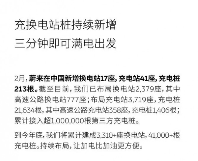 蔚來(lái)汽車(chē)官方宣布,2月份在中國(guó)市場(chǎng)新增了17座換電站和41座充電站,同時(shí)安裝了213根新的充電樁。