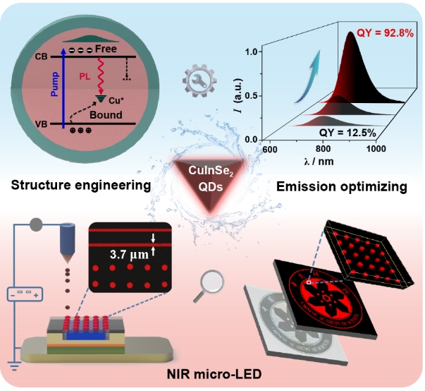 近期,中國科學(xué)院福建物質(zhì)結(jié)構(gòu)研究所/閩都創(chuàng)新實驗室的陳學(xué)元團隊涂大濤研究員等在國家自然科學(xué)基金重點項目和區(qū)域創(chuàng)新發(fā)展聯(lián)合基金等項目支持下,成功研發(fā)出CuInSe2:Zn2+(CISe: Zn2+)基高效近紅外量子點熒光粉,并首次將其應(yīng)用于micro-LED(圖1)。