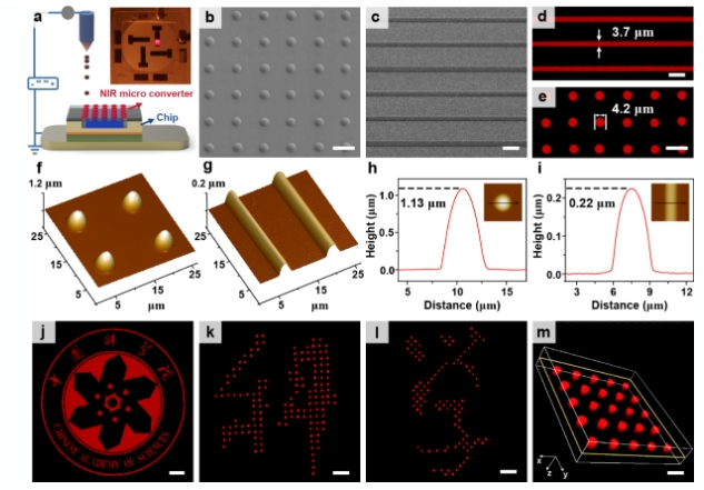 圖2、(a)制備micro-LED示意圖。Micro-LED陣列的(b-c)掃描電鏡圖、(d-e)近紅外熒光圖像和(f-i)原子力顯微鏡圖。基于micro-LED陣列噴印的(j)熒光圖案和(k-m)局部放大熒光圖像