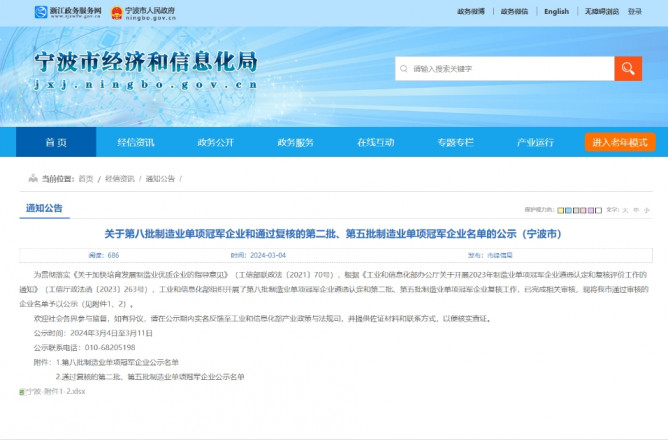 據(jù)了解,此次工信部通過(guò)的第八批制造業(yè)單項(xiàng)冠軍企業(yè)(產(chǎn)品)全國(guó)共388家,其中湖南省24家,寧波市21家。