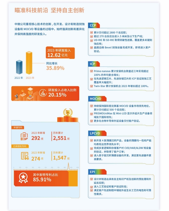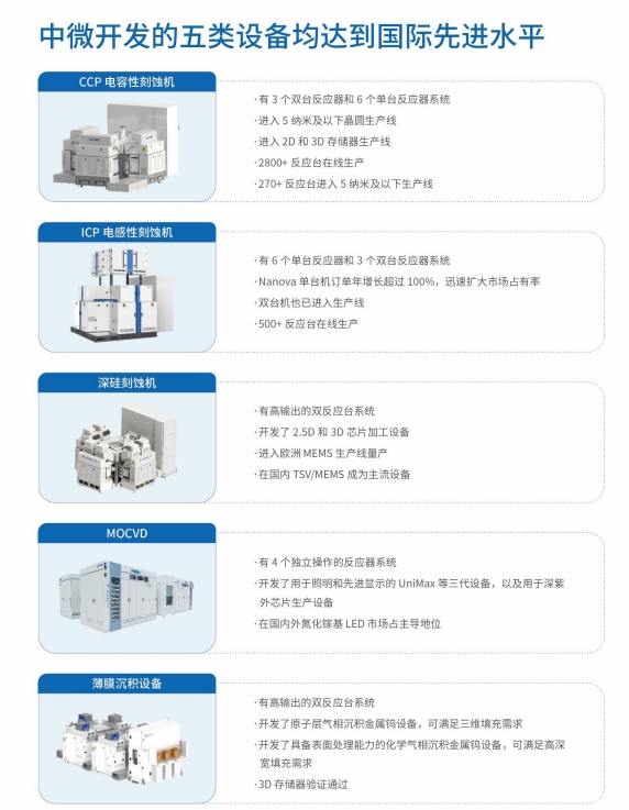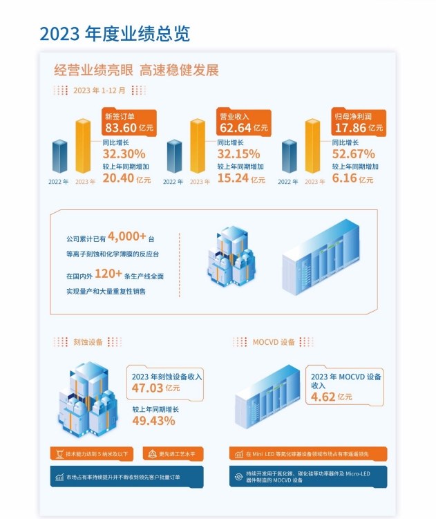 中微公司官微消息,中微公司2023年年度報告顯示公司累計已有4000+臺等離子刻蝕和化學(xué)薄膜的反應(yīng)臺,在國內(nèi)外120+條生產(chǎn)線全面實現(xiàn)量產(chǎn)和大量重復(fù)性銷售。在Mini LED等氮化鎵基設(shè)備領(lǐng)域市場占有率遙遙領(lǐng)先,持續(xù)開發(fā)用于氮化鎵、碳化硅等功率器件及Micro-LED器件制造的MOCVD設(shè)備。