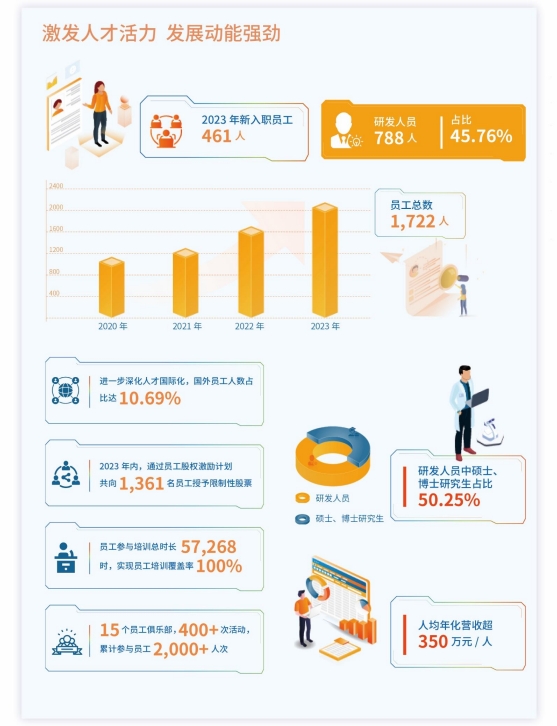 公司 2023 年新增訂單金額約 83.6 億元,較 2022 年新增訂單的 63.2 億元增加約 20.4 億元, 同比增長約 32.3%。其中刻蝕設(shè)備新增訂單約 69.5 億元,同比增長約 60.1%;由于中微的 MOCVD 設(shè)備已經(jīng)在藍綠光 LED 生產(chǎn)線上占據(jù)絕對領(lǐng)先的市占率,受終端市場波動影響,2023 年 MOCVD 設(shè)備訂單同比下降約 72.2%。 2023 年歸屬于母公司所有者的凈利潤約 17.86 億元,較上年同期增加 52.67%,主要系:2023 年收入增長和毛利維持較高水平,公司扣非后歸母凈利潤較上年同期增加約 2.72 億元。2023 年 2023 年年度報告 25 / 246 非經(jīng)常性損益約 5.94 億元,較上年同期的 2.50 億元增加約 3.44 億元。非經(jīng)常性損益的變動主要 系公司于 2023 年出售了部分持有的拓荊科技股份有限公司股票,產(chǎn)生稅后凈收益約 4.06 億元。 2023 年歸屬于母公司所有者的扣除非經(jīng)常性損益的凈利潤約 11.91 億元,較上年同期增加 29.58%,主要系:2023 年營業(yè)收入約 62.64 億元,較 2022 年增加約 15.24 億元,同比增長約 32.15%;2023 年毛利約 28.70 億元,較 2022 年增加約 7.02 億元,同比增長約 32.40%。 于報告期末,公司總資產(chǎn)約 215.26 億元,較報告期初增加 7.44%;歸屬于母公司的所有者權(quán) 益約 178.26 億元,較報告期初增加 15.13%。