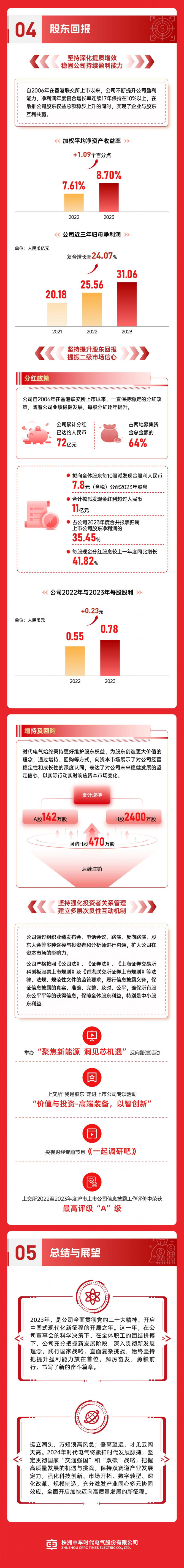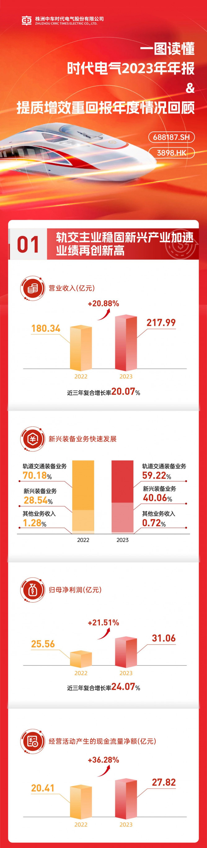 中車時(shí)代電氣官微時(shí)代電氣 2023 年年報(bào)&提質(zhì)增效重回報(bào)年度情況回顧。指出軌交主業(yè)穩(wěn)固新興產(chǎn)業(yè)加速業(yè)績(jī)?cè)賱?chuàng)新高。營(yíng)業(yè)收入近三年復(fù)合增長(zhǎng)率20.07%,新興裝備業(yè)務(wù)快速發(fā)展,歸母凈利潤(rùn)近三年復(fù)合增長(zhǎng)率24.07%。軌道交通領(lǐng)域穩(wěn)中有升,新興裝備領(lǐng)域增長(zhǎng)迅速。