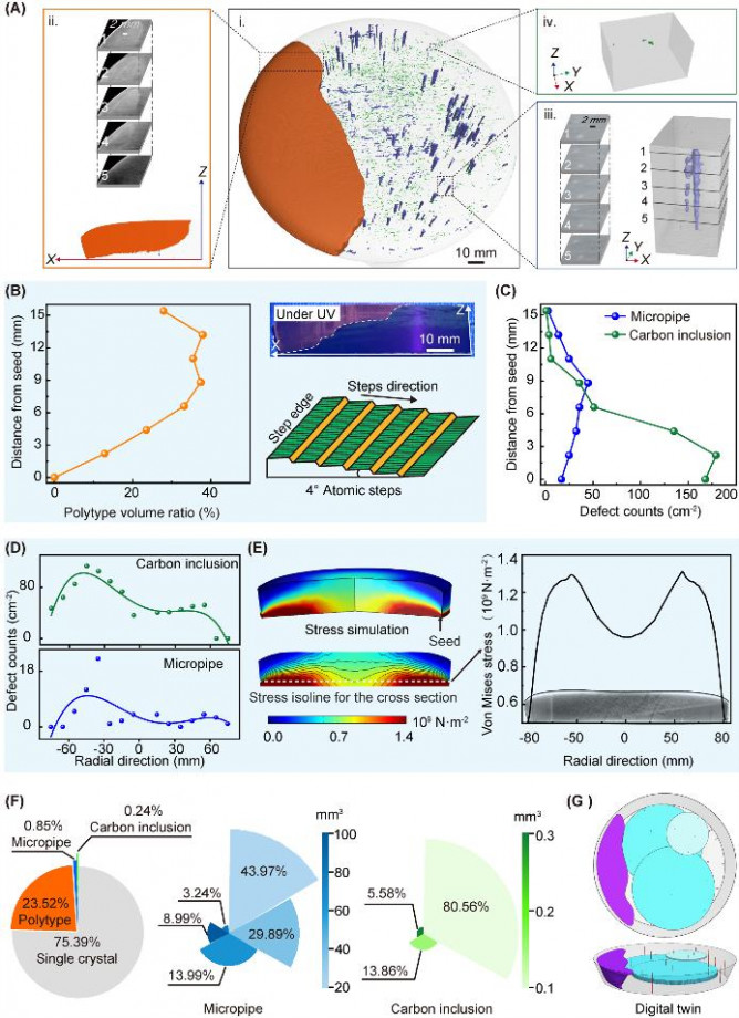 第三代半導(dǎo)體材料碳化硅(SiC)因其卓越的電學(xué)特性在高壓、高頻和高溫電子器件領(lǐng)域獲得巨大應(yīng)用。然而,傳統(tǒng)的SiC晶體PVT生長被認(rèn)為是一個(gè)“盲盒”,晶體質(zhì)量及工藝可靠性極易受多方面因素影響。當(dāng)前,針對SiC單晶的缺陷表征與質(zhì)量評價(jià)僅能依賴于各種破壞性測試實(shí)現(xiàn)。這些傳統(tǒng)方法不僅會造成晶體材料的損耗、耗時(shí)耗力,還難以用直觀的且多維度的方式追溯并呈現(xiàn)SiC晶體的生長過程。這也是當(dāng)前SiC單晶良率較低、襯底成本仍居高不下的原因之一。因此,迫切需要發(fā)展一種無損的、快速的、多維度的檢測方法,以識別和溯源大尺寸晶錠內(nèi)部缺陷的形成與演化,從而指導(dǎo)生長工藝的優(yōu)化。