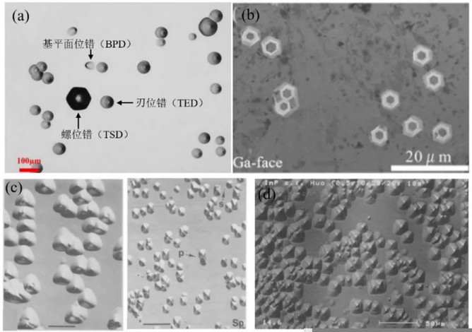圖1 化合物半導(dǎo)體SiC(a)、GaN(b)、GaAs(c)和InP(d)晶體中典型的缺陷形貌 SEM及其附帶的電子能譜儀(EDS)在觀察微觀形貌的同時進(jìn)行物質(zhì)微區(qū)成分分析。圖1是化合物半導(dǎo)體SiC、GaN、GaAs和InP晶體的SEM圖譜。這四種化合物半導(dǎo)體材料的晶型不同,其中GaN為六方纖鋅礦結(jié)構(gòu),所以典型的缺陷形貌為六角形;SiC單晶具有多種多晶型體,包括3C-SiC、4H-SiC和6H-SiC等,所對應(yīng)的缺陷形貌也更復(fù)雜。GaAs和InP具有相同面心立方“閃鋅礦”的晶體結(jié)構(gòu),可以看到它們的典型缺陷形貌也比較相似。