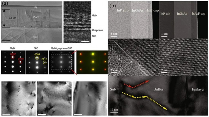 圖2(a) GaN/Graphene/SiC多層材料的TEM圖;(b) InP/In0.82Ga0.18As/InP異質(zhì)結(jié)截面的高分辨TEM圖