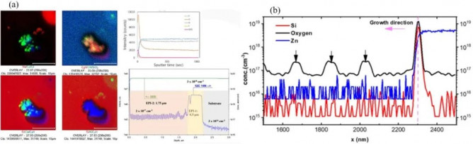 圖3(a) SiC外延層的ToF-SIMS和D-SIMS測試結(jié)果圖(b) SIMS 剖面圖顯示了 N 極 GaN 襯底上生長的 GaN/AlGaN 層中 Si、Zn 和氧的濃度。箭頭表示AlGaN層中的氧濃度高于GaN膜中的氧濃度。