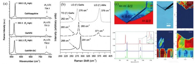 圖4(a) 不同襯底上生長的GaN的Raman圖譜; (b)不同組分的Raman圖譜;(c) SiC樣品的Raman和PL mapping圖