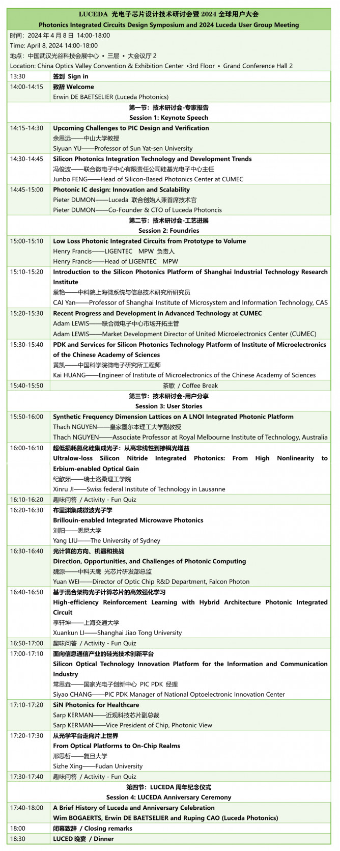 本次研討會(huì)有來自光電子領(lǐng)域國內(nèi)外的專家學(xué)者以及產(chǎn)業(yè)界的技術(shù)領(lǐng)軍人物,將從行業(yè)的不同領(lǐng)域、芯片設(shè)計(jì)全流程的不同視角,為與會(huì)者提供全面、前沿的技術(shù)見解。 Luceda 用戶將從光通信、光計(jì)算、傳感等不同領(lǐng)域,光電子芯片設(shè)計(jì)全流程的不同視角,提供基于真實(shí)實(shí)踐而來的經(jīng)驗(yàn)與寶貴成果。還特別邀請到全球光電子流片廠以多樣化的形式參與,LIGENTEC、SITRI、IMECAS等國內(nèi)外主流硅光工藝廠的專家也將來到現(xiàn)場,與芯片設(shè)計(jì)工程師探討最新的工藝進(jìn)展和創(chuàng)新攻堅(jiān)。