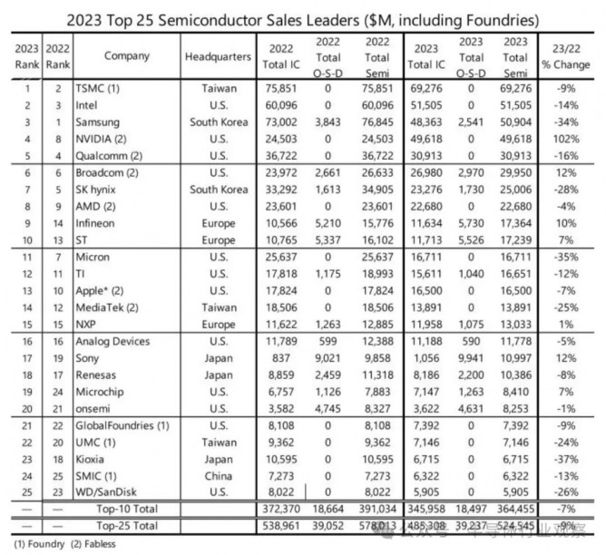 從個別公司的表現(xiàn)來看,臺積電作為行業(yè)領(lǐng)頭羊,雖然營收有所下降,但是以692億美元的營收榮登榜首。得益于其用于數(shù)據(jù)中心服務(wù)器人工智能(AI)工作負(fù)載的GPU處理器的巨大增長,英偉達(dá)在前25名中“鶴立雞群”,實(shí)現(xiàn)了102%三位數(shù)的漲幅,以496億美元的營收一躍從2022年的第八位來到第四。英飛凌以173億美元營收前進(jìn)了5個名次,躋身TOP10行列。