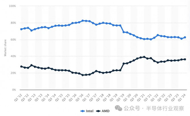 2012年至2024年全球Intel和AMD x86計(jì)算機(jī)中央處理器(CPU)分布(按季度)來源:statista