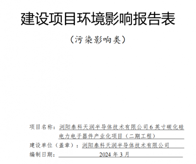 近日,泰科天潤披露了最新6英寸SiC電力電子器件產(chǎn)業(yè)化項目環(huán)境影響報告表。