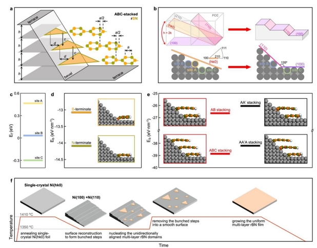 中國科學(xué)院物理研究所/北京凝聚態(tài)物理國家研究中心表面物理實驗室自中國科學(xué)院院士王恩哥創(chuàng)建SF1課題組以來,深耕硼碳氮輕元素材料表面制備研究。近年來,該團隊與北京大學(xué)的科研人員等合作,在氮化硼單晶制備方面取得進展。2019年,該團隊開發(fā)了利用表面對稱性破缺襯底外延非中心對稱型二維單晶的方法,實現(xiàn)了大面積單層hBN單晶薄膜制備。近日,該團隊進一步提出基于表面對稱性破缺襯底面內(nèi)、面外協(xié)同調(diào)控的創(chuàng)新機制,即通過在單晶金屬鎳表面構(gòu)建由(100)晶面和(110)晶面組成斜面高臺階,在化學(xué)氣相沉積的形核階段匹配并逐層鎖定rBN晶格的面內(nèi)晶格取向和面外滑移矢量,進而在大面積范圍內(nèi)誘導(dǎo)形成同向rBN晶疇。掃描透射電子顯微鏡觀測表明,取向一致的rBN晶疇通過逐層無縫拼接,形成具有精準(zhǔn)ABC原子堆垛的晶體結(jié)構(gòu),制備出rBN單晶,面積可達4×4平方厘米。