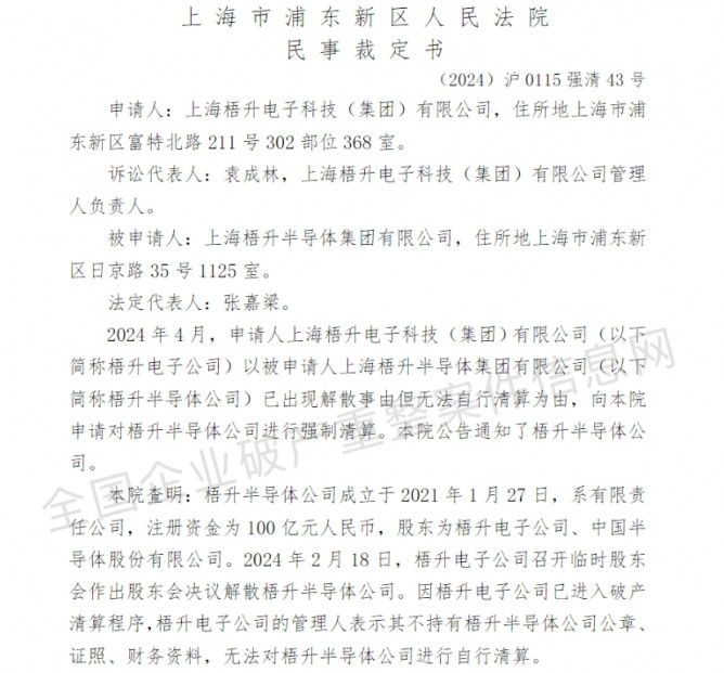 上海市浦東新區(qū)人民法院查明:梧升半導(dǎo)體公司成立于 2021年 1月 27日,注冊(cè)資金為 100億元,股東為梧升電子公司、中國(guó)半導(dǎo)體股份有限公司。2024年2月18日,梧升電子公司召開臨時(shí)股東會(huì)作出股東會(huì)決議解散梧升半導(dǎo)體公司。因梧升電子公司已進(jìn)入破產(chǎn)清算程序,梧升電子公司的管理人表示其不持有梧升半導(dǎo)體公司公章、證照、財(cái)務(wù)資料,無(wú)法對(duì)梧升半導(dǎo)體公司進(jìn)行自行清算。