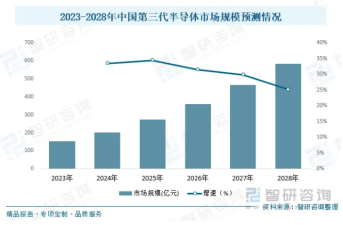 預(yù)計(jì)未來(lái),隨著互聯(lián)網(wǎng)與信息技術(shù)的持續(xù)進(jìn)步,對(duì)第三代半導(dǎo)體的需求會(huì)越來(lái)越高, 2023年到2028年的復(fù)合增長(zhǎng)率將達(dá)到30.83%,整體市場(chǎng)規(guī)模呈穩(wěn)定持續(xù)增長(zhǎng)趨勢(shì)。